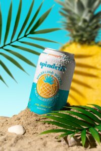 “A refreshing beverage or summer product can placed on golden sand with water droplets, surrounded by tropical leaves and bright sunlight. The background features a vivid sky-blue gradient with hints of yellow from a blurred pineapple or summer fruit. The lighting is warm and natural, evoking a tropical beach vibe. The composition highlights freshness, relaxation, and vacation energy — sharp focus on the product, shallow depth of field, and soft background blur. The overall style is clean, colorful, and hyperrealistic with glossy highlights and crisp details.”
