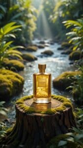 “A luxury product bottle or jar placed on a moss-covered tree stump in a lush tropical forest beside a clear flowing river. Sunlight filters gently through the dense foliage, casting soft rays and golden reflections on the product. The atmosphere is serene, natural, and cinematic, evoking purity, elegance, and connection to nature. The composition highlights the product as the focal point amid vibrant greenery and glowing water reflections. The overall mood combines sophistication with tranquility in a hyperrealistic, high-end photography style.”