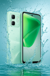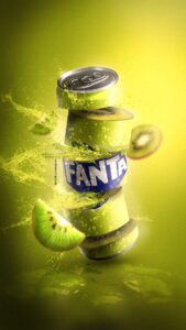 “A dynamic commercial product shot featuring a beverage can or bottle surrounded by splashing liquid and floating fruit slices. The product appears as if it’s bursting with energy — suspended mid-air, partially sliced, with droplets and bubbles emphasizing freshness and motion. The background is a bright monochromatic gradient (lime green or matching the flavor theme), illuminated with vivid highlights and smooth shadows. The overall composition conveys intensity, freshness, and effervescence in a hyperrealistic, cinematic style.”