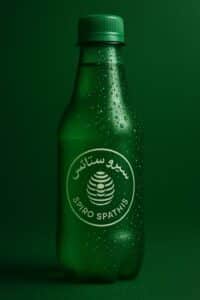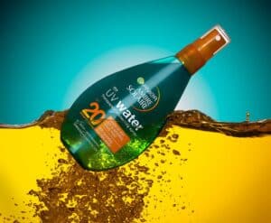 “A high-end beauty or skincare product bottle emerging from vibrant, translucent liquid captured mid-motion. The scene features a bold color contrast — golden liquid splashing against a turquoise or teal gradient background. Bright studio lighting highlights the transparency and reflections on the bottle and the liquid surface. The composition evokes freshness, summer energy, and luxury, with precise focus and dynamic movement of water droplets and waves. The overall style is hyperrealistic and glossy, with cinematic lighting and perfect symmetry.”