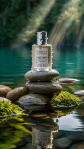 “A luxury product bottle or jar placed outdoors on a stack of smooth wet stones surrounded by a serene natural lake or forest. Sun rays filter gently through the trees, casting warm light and reflections on the water. Dew drops and moisture glisten on the product surface, emphasizing freshness, purity, and calm. The scene feels balanced and zen-like, blending nature and elegance. The overall composition is hyperrealistic, cinematic, and tranquil, with rich textures of water, moss, and stone.”