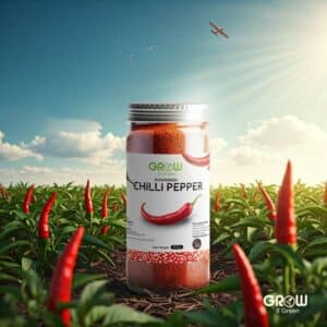 “A realistic commercial product photo showing a jar or bottle of natural product placed directly in its source field. The jar stands upright among growing plants that match the product’s ingredients (such as chili, herbs, or spices). The background shows a bright blue sky, sunlight rays, and soft clouds, creating a sense of purity and freshness. The composition blends agriculture and packaging design — symbolizing farm-to-table quality. The lighting is cinematic, warm, and natural, emphasizing authenticity, sustainability, and connection to nature.”