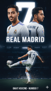 Professional football (soccer) poster featuring [refer image]. Keep the original face, hair, shape, and angle exactly as in the image. Show the perSon in three perspectives: a super close-up portrait with real madrid jersey 2025, a side profile view wearing a real madrid football jersey 2025 in the back name Ghait Houcine, and a full-body shot in full football kit (jersey real madrid 2025, shorts, socks, and cleats) with sponsor logos. At the bottom, place a dynamic action scene of the player performing a powerful Salto kick with motion blur and flying grass around. The jersey must clearly display the number 7 on the front, back, and shorts. Use a bold dark White Santiago bernabeu stadium background with a large number 7 dan nama ‘real madrid’ glowing behind the character