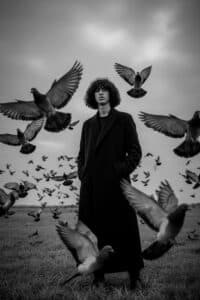 “A dramatic black and white portrait of a young man standing in an open field under a cloudy sky. He is wearing a long, dark overcoat with his hands in his pockets. Around him, a large flock of pigeons is flying in different directions, some very close to the camera and others in the background, creating a sense of motion and intensity. The man stands calmly and confidently in the center, looking directly at the camera with a serious expression. The atmosphere is cinematic, moody, and artistic, emphasizing contrast and depth.”
