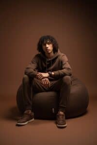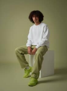 “A minimalist studio portrait of a young man sitting on a simple white cube against a plain olive green background. He is wearing a plain white oversized sweatshirt, light olive green cargo pants, and matching bright green sneakers. His pose is casual, sitting with his hands resting loosely between his legs, looking calmly at the camera with a neutral expression. The lighting is soft and even, creating a clean and modern fashion look with a muted color palette and a focus on simplicity and style.”