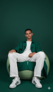 “A stylish portrait of a young man sitting on a light green bean bag chair in front of a solid dark green background. He is wearing a plain white t-shirt, loose white linen pants, and a long emerald green trench coat. On his feet, he has white Adidas-style sneakers with black stripes. His pose is relaxed, leaning back slightly with one hand resting on his knee and the other on the bean bag. The expression is calm and confident, looking directly into the camera. The lighting is soft and balanced, highlighting the outfit and face without harsh shadows. The overall aesthetic is modern, minimalistic, and fashionable, with a strong green and white color theme.”