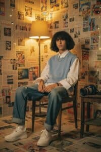 “A highly realistic portrait of [your face features from reference photo], sitting on a wooden chair in a vintage room decorated with old newspaper clippings covering the walls and floor. A warm lamp glows beside him, creating cozy cinematic lighting with soft shadows. He is wearing a white shirt layered with a light blue sweater vest, ripped blue jeans, and white sneakers. A camera is placed on a small wooden table nearby. Editorial photography style, nostalgic atmosphere, sharp details, natural skin tones, high realism.”