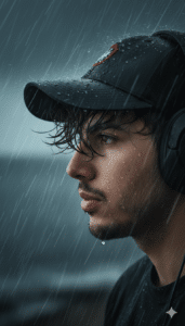 Close-up portrait of a young 21 year old boy(attached photo) in the rain, seen from profile, looking into the distance with a melancholic expression. he is wearing a dark baseball cap with a red detail and black over-ear headphones. His heavy dark hair is tousled by the coastal wind, falling leicht ins Gesicht, voller Textur und Bewegung.. Raindrops are clearly visible on his skin. The background is a heavily blurred, dark, rainy outdoor scene with visible streaks of falling rain.