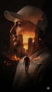 A cinematic double exposure of me in profile, with a post-apocalyptic cityscape inside his silhouette.The inner scene shows the man walking through a destroyed, burning urban street, buildings in ruins, glowing embers and fire, with a dramatic sunset in the background. Moody lighting, warm tones, emotional and introspective mood, high detail, 8K resolution