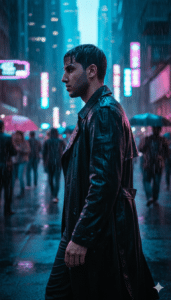 Cinematic shot of me walking against a rushing cyber city crowd, all others are blurred with motion trails, slow-shutter, i’m in focus, side profile- serious looking at a far distance, it’s raininv and I am soaked. Wearing a long trench coat. Neon cyberpunk tones, 35mm film look, ambient lighting from neon signs ratio: 4:3
