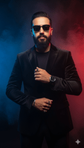 well-groomed beard and mustache wearing a dark velvet suit and sunglasses, posing confidently in a moody studio setting. The background is dramatically split with blue smoke on the left and red smoke on the right, creating a high-contrast, cinematic atmosphere. He has multiple rings on his fingers and a luxury watch on his wrist, adding a touch of sophistication. The lighting highlights the contours of