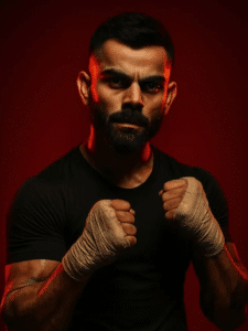 ultra-realistic cinematic image of a young man (use uploaded face) style the person as a strong, focused boxer wearing a fitted dark athletic t-shirt with fists wrapped in tape. set the subject against a bold red background. use cinematic lighting with deep shadows and strong highlights to emphasize muscle tone and facial expression.