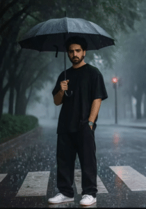 Wearing an oversized black t-shirt, black box pants, snekers.using an umbrella on the sidewalk about to cross the road at a red light, many trees, beside the sidewalk.heavy rain. Ratio 9:16
